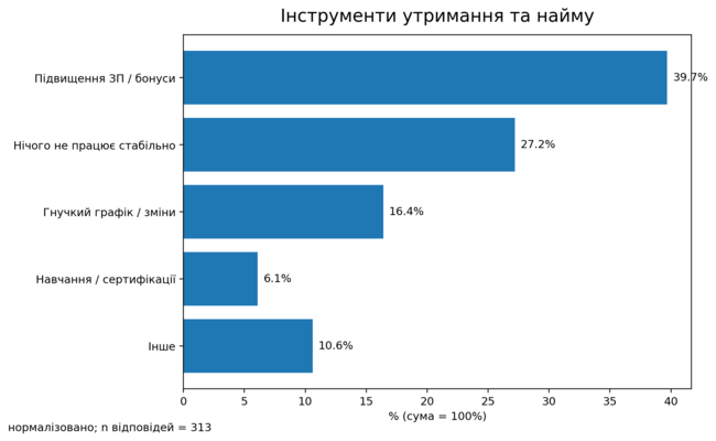 Щодо інструментів утримання й найму, відповіді свідчать про прагматичний підхід: фінансова мотивація, умови, гнучкість. При цьому частина респондентів констатує, що жоден інструмент не працює стабільно — доводиться комбінувати й підлаштовуватися під локальний ринок праці.