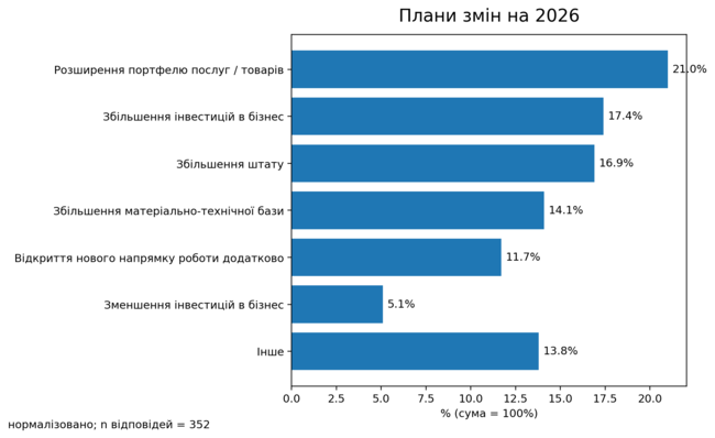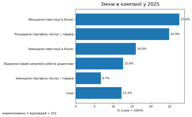 Стратегічний блок відповідей також показовий: частина бізнесів інвестувала й розширювала портфель, частина — діяла обережніше, оптимізуючи витрати та переглядаючи інвестиційні плани. Це не суперечність, а природна реакція ринку, де компанії мають різну структуру клієнтів, різну маржинальність і різні можливості фінансування.
