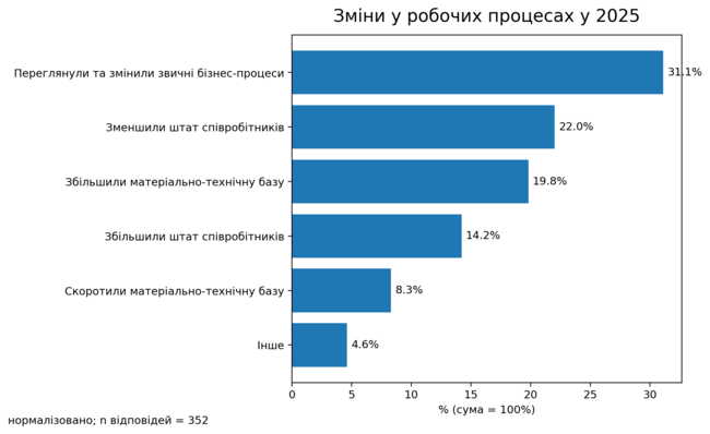 Опитування показує: бізнес не просто реагував на обставини, а перебудовував операційну модель. Компанії змінювали процеси, посилювали матеріально-технічну базу, коригували підходи до організації роботи. Паралельно відбувалися й кадрові рухи — як у бік скорочення, так і в бік розширення штату.
