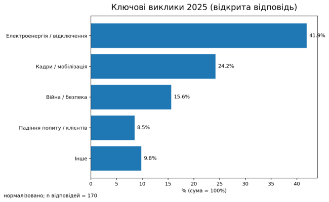 Відкриті відповіді підсилюють цю тезу: респонденти говорили передусім про практичні бар’єри, які впливають на щоденні рішення — від кадрів до інфраструктури.