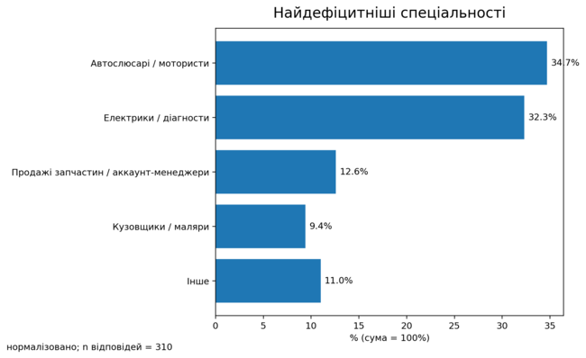 Найважче закривати спеціальності, які напряму визначають виробничу потужність сервісу: механіки/мотористи та електрики/діагности. Це означає, що кадровий дефіцит безпосередньо впливає на спроможність бізнесу обслуговувати потік клієнтів.