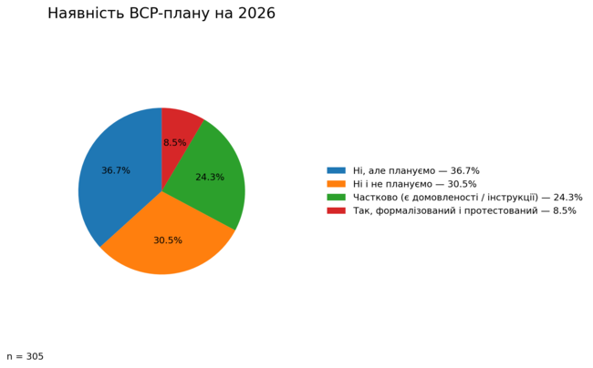 Блок про готовність до 2026 року чітко показує: системні інструменти управління ризиками ще не стали для ринку стандартом. Частина компаній має план безперервності, частина — працює за «неформальними сценаріями», а значна кількість бізнесів лише планує або не планує вводити стратегічний план забезпечення безперервності бізнесу (BCP).