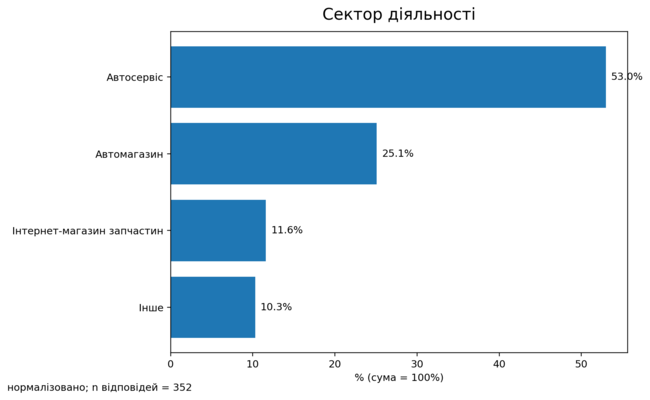 Структура вибірки показує, що опитування охоплює передусім практичний, операційний сегмент ринку — тих, хто щодня працює з ремонтом, продажем і підбором запчастин, організацією сервісу та управлінням командою.