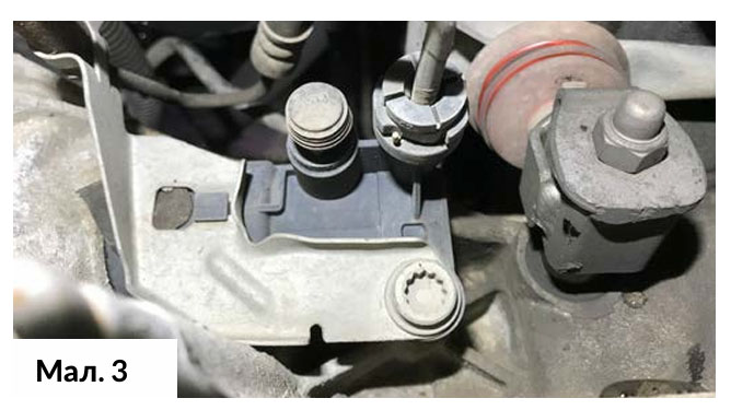 З лівої сторони розташований робочий циліндр зчеплення та інший кінець тяги перемикання передач. На робочому циліндрі закріплений гідравлічний шланг. Шланг від’єднали від робочого циліндра, а його кінець був закритий для недопущення проникнення сміття. Потім відкрутили та зняли кріпильну гайку тяги перемикання передач. (Мал. 3)