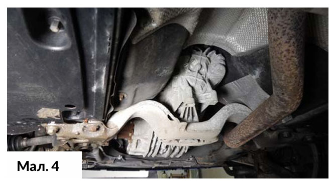 Важлива порада: щоб виконати цю операцію необхідно опустити вихлопну трубу, для цього треба від’єднати її від колектора або демонтувати кріплення вихлопної труби (розташоване посередині вихлопної труби), щоб залишити достатньо простору між вихлопною трубою та кузовом автомобіля. (Мал. 4)