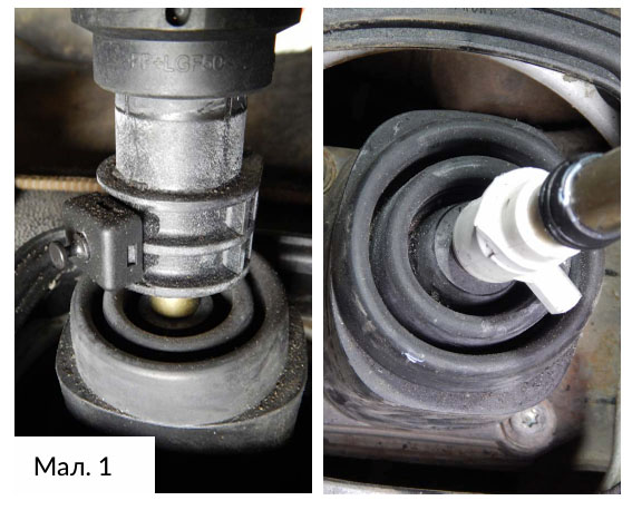Цей Transit — це варіант із заднім приводом, оснащений дизельним двигуном 2,4 TDCi. Тому, щоб розпочати процес демонтажу коробки передач, спочатку потрібно вийняти важіль перемикання передач зсередини кабіни, знявши гумовий чохол і звукоізоляцію навколо важеля (у «нейтральному» положенні), а потім від’єднати привід на подовжувачі важеля передач, щоб «звільнити» його від нижньої частини. Потім відкрутити чотири кріпильні болти трансмісії, це дозволить повністю зняти важіль коробки передач. (Мал. 1)