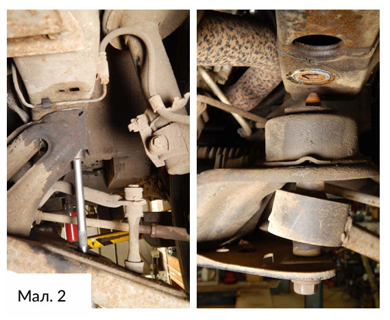 Зніміть опору трансмісії, який кріпиться болтами до балки передньої осі. Тепер коробка передач готова до демонтажу – залишилися тільки болти кріплення корпусу. Однак через зазор між кузовом і балкою передньої осі трансмісія не пройде.