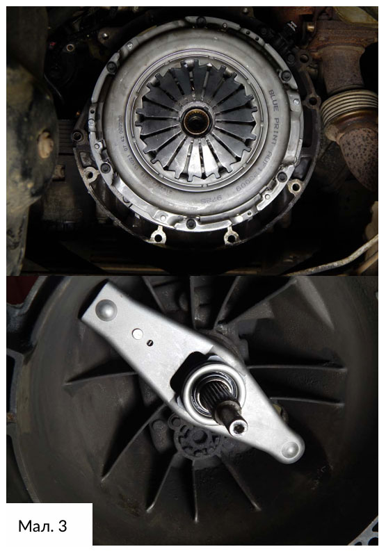 Наступний етап – вижимний підшипник. Ретельно очистіть корпус трансмісії, щоб видалити все мастило, бруд та інші залишки від попереднього зчеплення. Потім зніміть вилку зчеплення та перевірте її на наявність тріщин та/або ознак зношування. (Мал. 3)