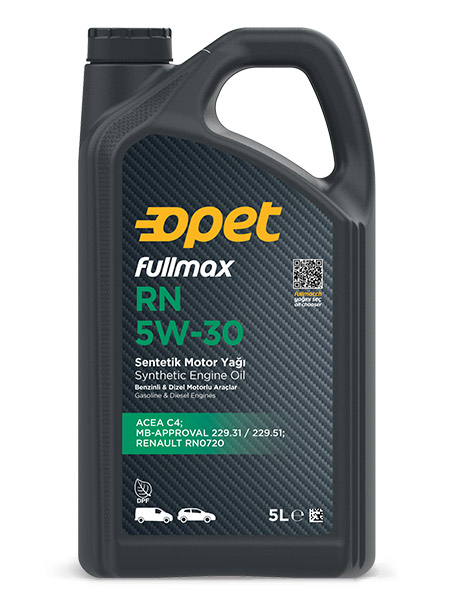 Повністю синтетична олива від Opet з оптимізованим вмістом фосфору, сірки та низьким показником зольності (Low SAPS) призначена для використання у двигунах Renault з DPF (дизельним сажовим фільтром) та іншими системами очищення відпрацьованих газів. Fullmax RN 5W-30 відноситься до класу ACEA C4 та рекомендована для автомобілів з нормами викидів на рівні Євро-5 та Євро-6.