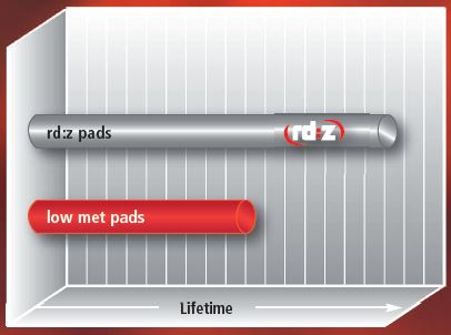 Зменшення зносуПід час гальмування неминуче виникає тертя, в наслідок якого навколишнє середовище забруднюється дрібними частинками пилу. Гальмівні колодки rd:z від Zimmermann вирішують цю проблему за допомогою інноваційної суміші матеріалів: колодки містять, серед іншого, органічні волокна. При кожному гальмуванні між колодкою і диском утворюється тонкий «шар», який покращує як відчуття гальмування, так і його ефективність, одночасно зменшуючи знос. Термін служби колодок практично подвоюється. В результаті колодки також активно сприяють зниженню забруднення повітря в центральних районах міст та покращенню якості життя.