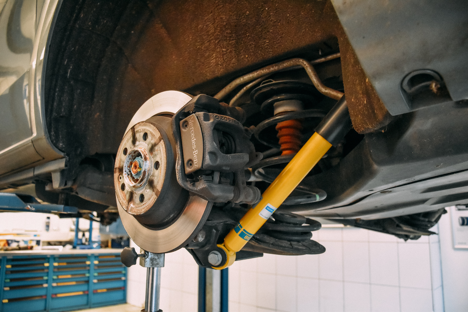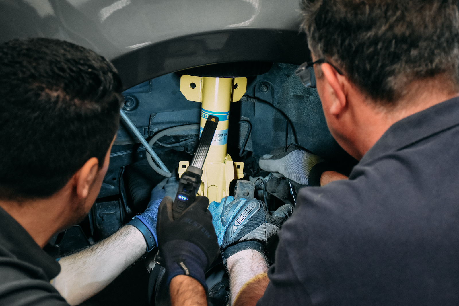 Переобладнання V-класу амортизаторами BILSTEIN B6 — нескладне завдання для професіоналів. Втім, робота з передньою віссю потребує більше часу: спершу необхідно дістатися до кріплень стійок, потім розібрати стандартні стійки й зібрати їх заново вже з амортизаторами BILSTEIN B6.