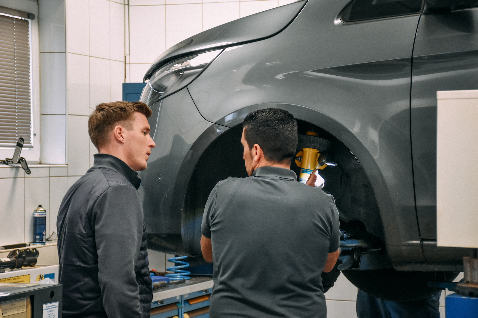 Тож одного ранку з юнацьким завзяттям колеги взялися за переобладнання мінівена в навчальній майстерні BILSTEIN в Еннепеталі.Усе — за правилами, як годиться для практичного тесту. Райнер Попіол, Мустафа Явуз — керівник технічної підтримки BILSTEIN — та технік Дірк Добрзінський спершу оглянули авто та винесли вердикт - усі погодилися, що, хоч автомобіль і відносно новий, а амортизатори виглядають справними, налаштування підвіски, вочевидь, не відповідає практичному використанню — як сімейного та туристичного фургона з керованим навантаженням. Адже тест-драйв із невеликим навантаженням виявив помітний крен у поворотах і розгойдування, особливо під час рушання. Крім того, керованість здавалася недостатньо точною.