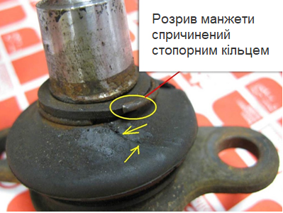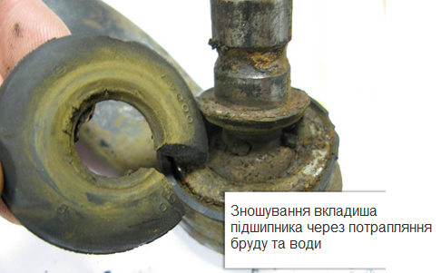 Пошкодження завальцювання кульової опори під час монтажу і, як наслідок, потрапляння вологи, вимивання мастила, корозія металу та виліт пальця.