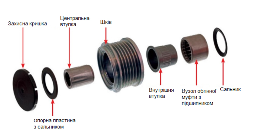 OAP має просту обгінну муфту, розташовану всередині шківа. Після вимкнення двигуна ротор генератора продовжує обертатися через свою велику масу, але при цьому він не приводить в рух шків.