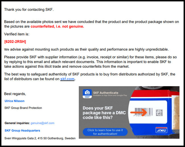 Важливо робити максимально якісні фото, оскільки саме від цього залежить точність перевірки. Відповідь надходить на електронну пошту. У цьому випадку по підробленому підшипнику результат перевірки був однозначний — контрафакт.