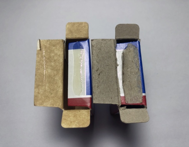 Зліва підробка. Справа оригінал. Зверніть увагу на клей, а також на колір паперу всередині коробки.