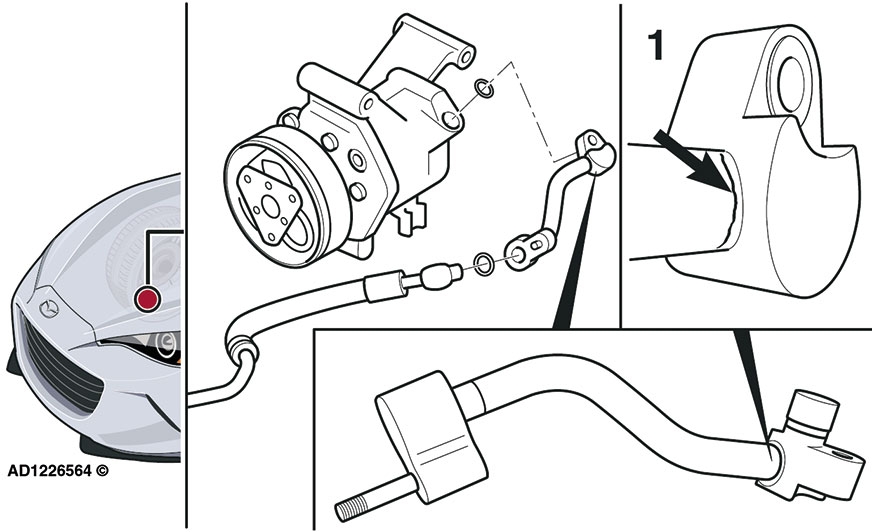 Відповідь: Описана проблема виникає в моделях MX-5, виготовлених у період з 14 травня 2015 року по 19 червня 2018 року. Перевірте трубопровід високого тиску холодоагенту в місці його з'єднання з компресором кондиціонера. При уважному огляді ви помітите тоненьку тріщину на трубопровіді високого тиску фреону (рис. 2.1). Пошкодження трубопроводу високого тиску холодоагенту спричинене рухом двигуна. Встановіть новий трубопровід високого тиску фреону. Заправте систему кондиціонування належною кількістю холодоагенту. Це повинно усунути несправність.