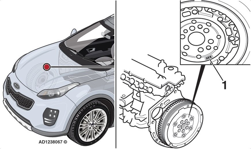 Питання: Наш клієнт зіткнувся з проблемою пропусків запалювання у своєму Kia Sportage 1.6 T-GDi 2016 року випуску. Горить попереджувальний індикатор несправності двигуна, а в пам'яті несправностей керуючого комп'ютера (ECM) записано кілька кодів несправностей, пов'язаних з пропусками запалювання. Ми провели базову перевірку проводки та замінили свічки запалювання, але несправність залишається. Чи чули ви раніше про проблеми з пропусками запалювання у цій моделі?Відповідь: Так, ми бачили численні коди помилок пропусків запалювання (P0300, P0301, P0302, P0303, P0304), які виникають у моделях Sportage з кодом двигуна G4FJ і механічною коробкою передач до 03/18. Пропуски запалювання спричинені несправною конструкцією двомасового маховика. Перевірте код дати виробництва на двомасовому маховику (фото 1.1). Якщо це модель до MLE, встановіть новий двомасовий маховик. Видаліть коди несправностей. Після завершення ремонту слід виконати пробну поїздку, щоб переконатися, що несправність усунена.
