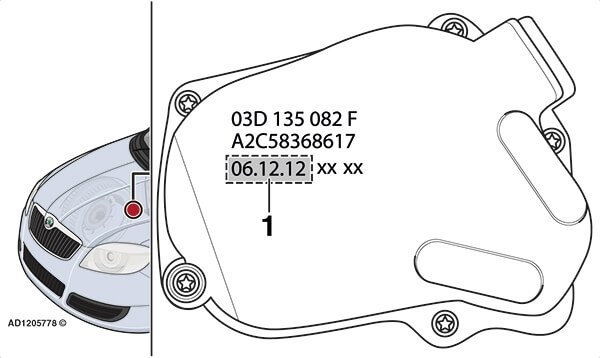 Відповідь: Так, ця несправність нам відома і стосується моделей Fabia II і Roomster з кодом двигуна CGPA. Її причиною, ймовірно, є несправний комп'ютер управління дросельною заслінкою. Перевірте код дати виробництва на комп'ютері управління дросельною заслінкою (рис.1.1). Якщо дата виробництва до 06.12.2012, комп'ютер управління дросельною заслінкою необхідно замінити. Це повинно усунути несправність.