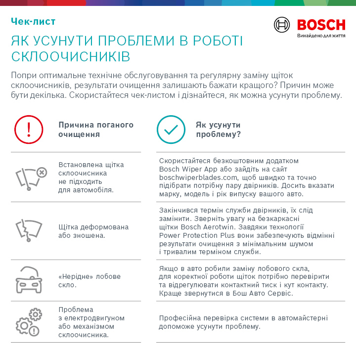 Чек-лист: як усунути проблеми в роботі склоочисниківПопри оптимальне технічне обслуговування та регулярну заміну щіток склоочисників, результати очищення залишають бажати кращого? Причин може бути декілька. Скористайтеся чек-листом і дізнайтеся, як можна усунути проблему.