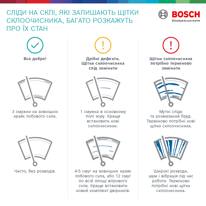 Щітки склоочисника слід перевіряти кожні шість місяців і замінювати мінімум раз на рік. Якщо двірники погано прилягають до поверхні скла, їх гума пошкоджена або втратила еластичність, вони можуть почати скрипіти, залишати розводи та смуги, погіршувати видимість.