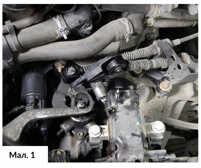 Після прибуття автомобіля до автомайстерні, відкрили капот і вийняли акумулятор, піддон акумулятора та повітряний фільтр в зборі, щоб забезпечити доступ до верхньої частини коробки передач. Після чого, з’явився доступ до перемикача передач, робочого циліндру зчеплення, стартера та кріплення коробки передач. (Мал. 1)
