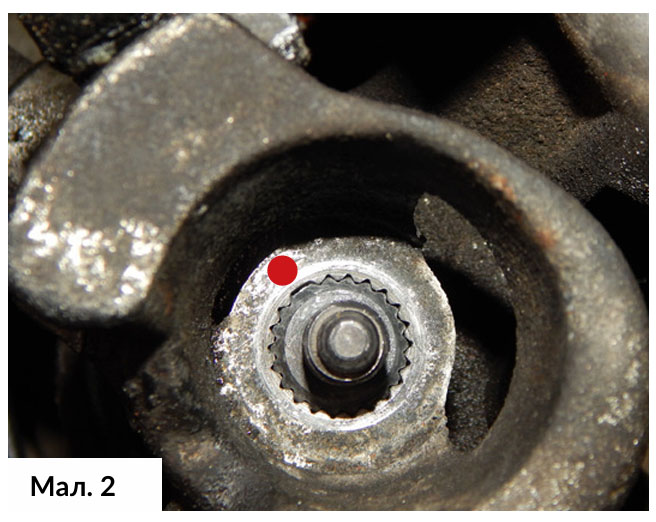 Спочатку від’єднали троси управління КПП від механізму перемикача передач. Потім відкрутили три кріпильні болти кронштейну тросів КПП, а троси відклали в сторону. Після цього, обережно зняли пластиковий затискач, що утримує важіль перемикання. Далі, відкрутили та демонтували важіль управління на коробці передач. Завдяки цьому стало можливим витягнути стартер. З’явився додатковий простір для зняття коробки передач. Вал важеля КПП має контрольний шліц, коли справа доходить до заміни важеля, його можна встановлювати тільки в одному положенні. (Мал. 2)