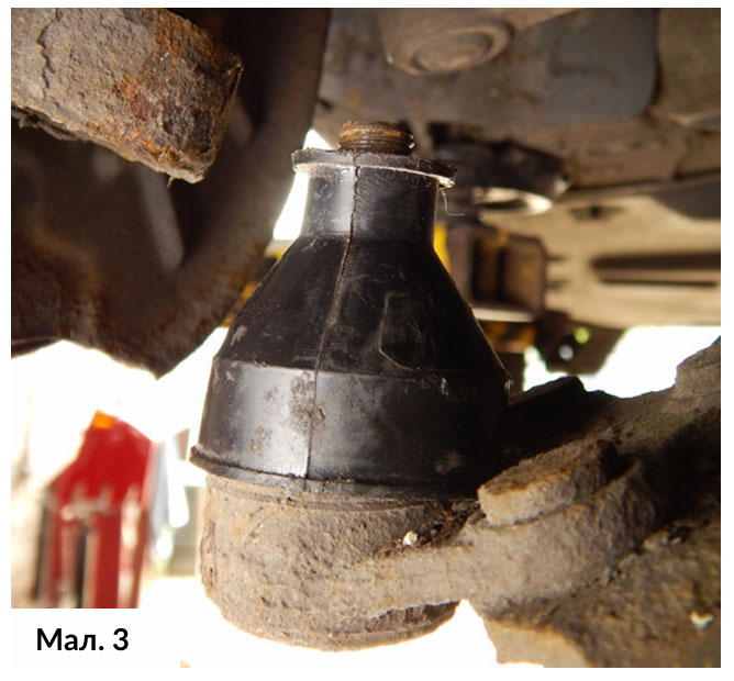 Спочатку зняли передні колеса. Потім зняли обидві гайки кульової опори нижнього важеля підвіски. Шарніри звільнили від маточини та накрили пластиковою кришечкою, щоб захистити гумовий пильовик та різьбу від будь-яких потенційних пошкоджень (Мал. 3). Далі черга дійшла до лівого колісного підкрилка.