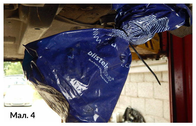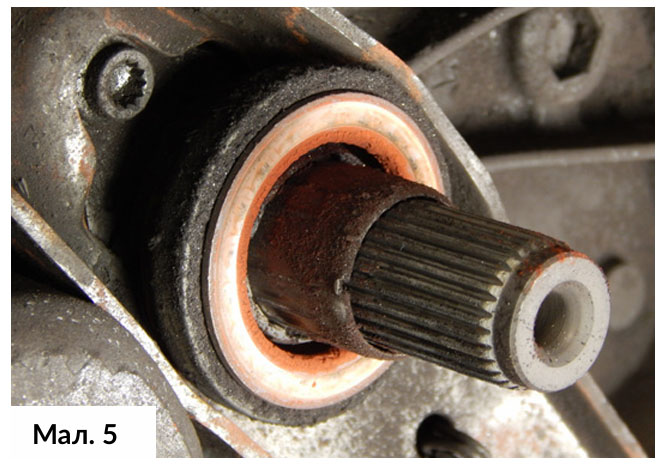 Потім відкрутили внутрішні кріпильні болти з’єднання привідного валу. Привідні вали можна витягнути із ступичних фланців, щоб забезпечити доступ для зняття коробки передач. Шарнір рівних кутових швидкостей привідного валу загорнули в поліетиленову плівку, щоб запобігти потраплянню будь-яких піщинок в з’єднання, поки вони не будуть готові до встановлення в початкове положення. (Мал. 4)