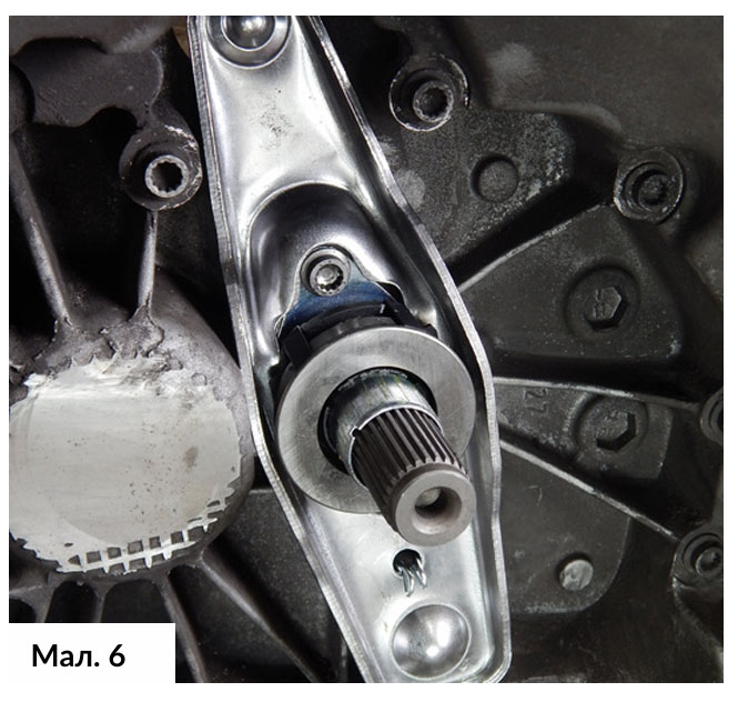 Звернувши увагу на механізм приводу зчеплення, можна бачити, що необхідно зняти два болти, щоб вийняти вилку зчеплення в комплекті з направляючою втулкою та підшипником. Таким чином, виявлено ущільнення первинного валу, яке необхідно перевірити на наявність будь-яких витоків мастила. Поверхню очистили перед встановленням нових деталей. Змастили місця ковзання, а нову вилку зчеплення, підшипник і направляючий фланець встановили на місце та затягнули кріпильними болтами . Новий вижиманий підшипник зчеплення обертали до того часу, доки фіксатори не втиснулися у вилку зчеплення . Потім провели тестування для перевірки плавності ходу. (Мал. 6)