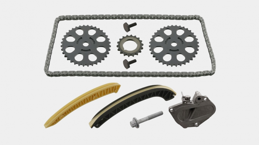 До нового комплекту ланцюга ГРМ (febi 30607) входять зірочки і нові болти для розподільного і колінчастого валів, ланцюг, болт шківа колінчастого валу, оновлений гідравлічний натягувач ланцюга і подовжені модифіковані направляючі, покликані запобігти тому, щоб ланцюг знов перескочив в майбутньому. (Мал. 4)