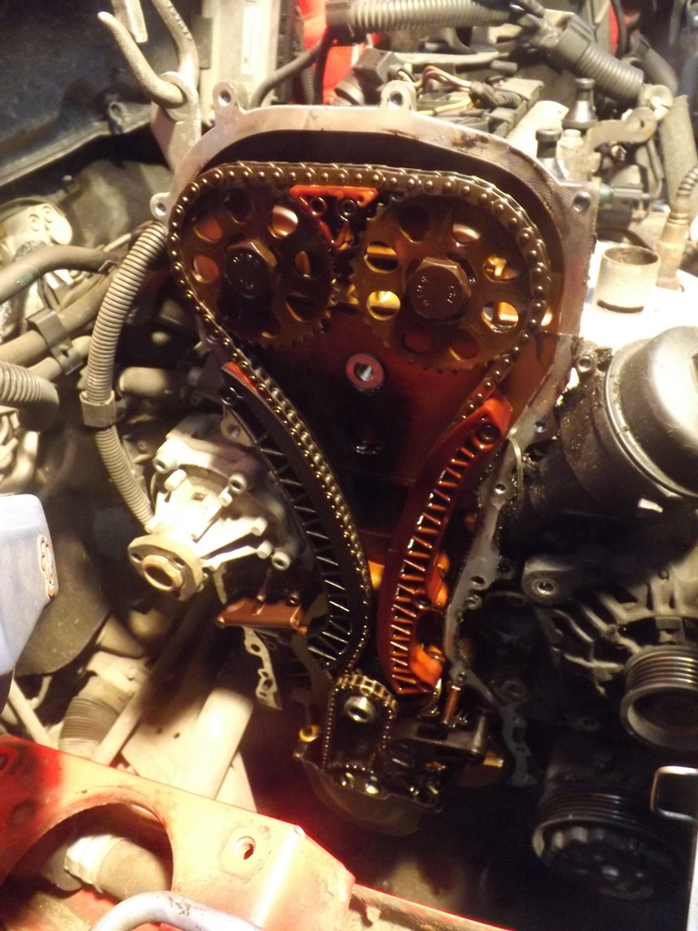 Дослідження і ремонтПрацюючи з цим двигуном важливо використовувати відповідні інструменти, щоб забезпечити коректну синхронізацію фаз газорозподілення двигуна, кривошипата розподільних валів. Сервісні мітки або шпоночні пази відсутні на зірочках або шківах розподільних валів. Моторне мастило було злито і згідно рекомендацій виробника були демонтовані ремені, шківи, труби, кріплення двигуна, кабельні джгути, кришка ланцюга ГРМ, масляний піддон та масляний насос, для того, щоб отримати доступ до ланцюга ГРМ для його огляду.