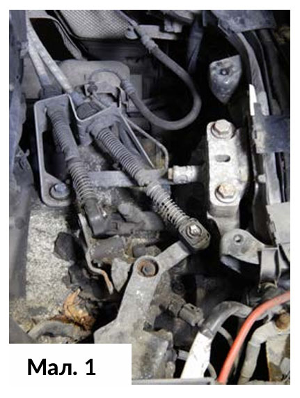 Транспортний засіб був доставлений до автомайстерні; капот було відкрито, акумулятор, акумуляторний піддон та вузол повітряного фільтра повітря були зняті, щоб отримати доступ до верхньої частини коробки передач. Таким чином з’явився доступ до механізму перемикання передач, до робочого циліндру зчеплення, стартера та опори трансмісії. (Мал. 1)