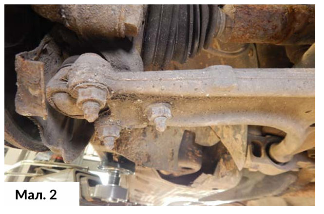 Були зняті передні колеса, потім лівий передній кріпильний болт привідного валу, а вже потім обидва кріпильні болти шарніра нижнього важеля підвіски (Мал.2) та підкрилок лівої колісної арки.