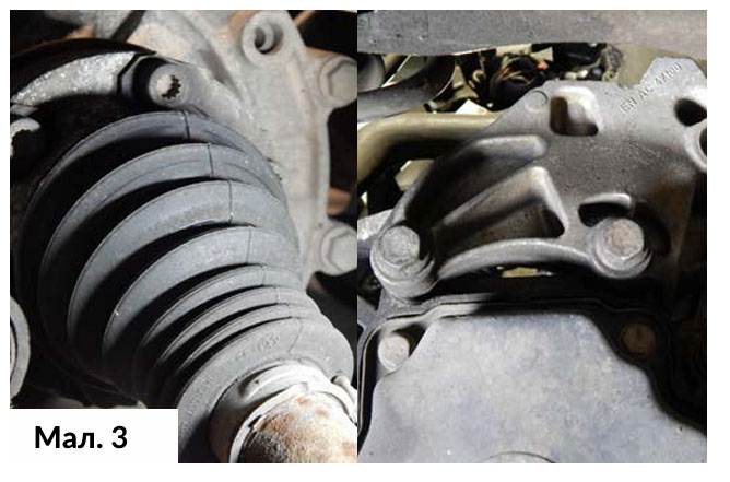 Внутрішні кріпильні болти привідного валу були відкручені, потім привідні вали були від’єднанні від фланців приводу. Правий привідний вал був зафіксований з одного боку, в той час як лівий привідний вал був демонтований, щоб отримати простір для демонтажу коробки передач. (Мал. 3)