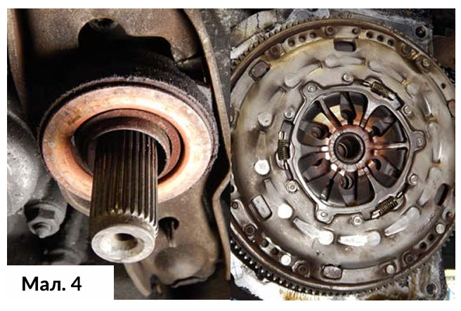 Корзина зчеплення, фрикційний диск та маховик були зняті та перевірені. Після огляду вижимного підшипника стало зрозуміло, що він зносився та почав заїдати за час експлуатації; однак основною причиною шуму та високочастотних вібрацій виявився маховик. Незважаючи на те, що на фрикційній поверхні не було жодних ознак утворення борозен, тріщин або «посиніння», під час перевірки стало зрозуміло, що маховик мав надлишковий люфт, а також пошкодження внутрішніх компонентів. (Мал. 4) Дійшли висновку, що повний комплект зчеплення потребує заміни.