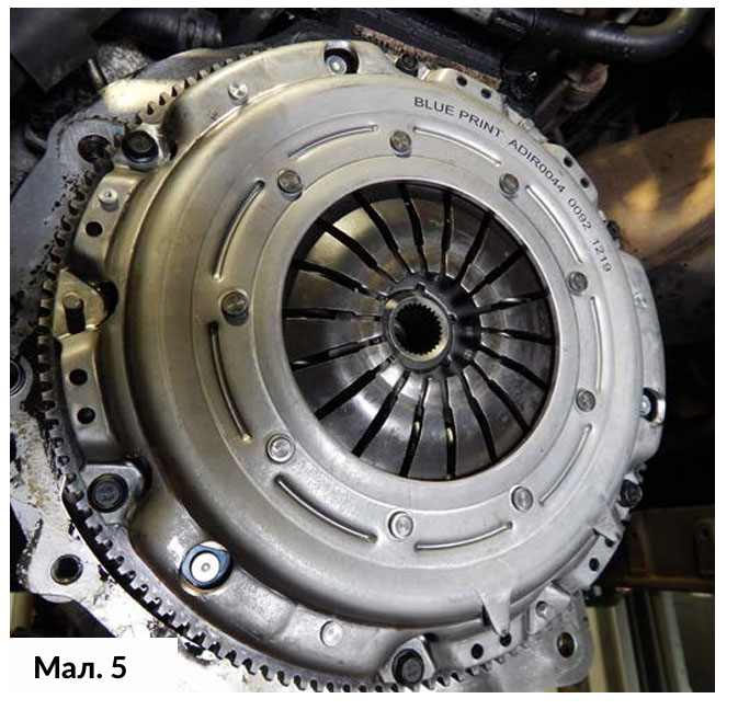 Перед встановленням нового диска та корзини були очищені контактні поверхні, всі деталі були відцентровані та суміщені з маховиком, потім зафіксовані новими кріпильними болтами. Всі шість кріпильних болтів корзини зчеплення були затягнуті по діагоналі, щоб забезпечити «рівномірний» контакт та запобігти можливому пошкодженню корзини зчеплення та центруючих штифтів маховика. (Мал. 5)
